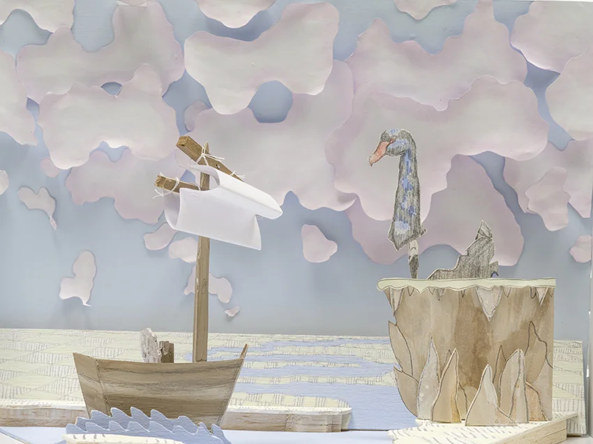 Swan Song # 7 was originally shown at the Museum of Brisbane from May 2014 to January 2015, as part of the exhibition ‘David Malouf and Friends’. The work reinterprets an earlier watercolour on paper image as a large-scale interactive installation, which responds to the novella, ‘Fly Away Peter’, written by David Malouf. Visitors were given narrative control, able to pose in the set with paper props provided by the artist, folding their own hats and eyeglasses, and choosing between the identity of a Pirate or a Navy Captain. Throughout the exhibition gallery goers were encouraged to share their adventurous snaps on instagram under the hashtag #maloufandfriends. On opening night, as a tribute to Malouf's post-colonial subject matter, a baritone dressed as a cane toad sang excerpts of libretti from ‘Voss’, an Australian Opera written by David Malouf about the explorer Ludwig Leichhardt.